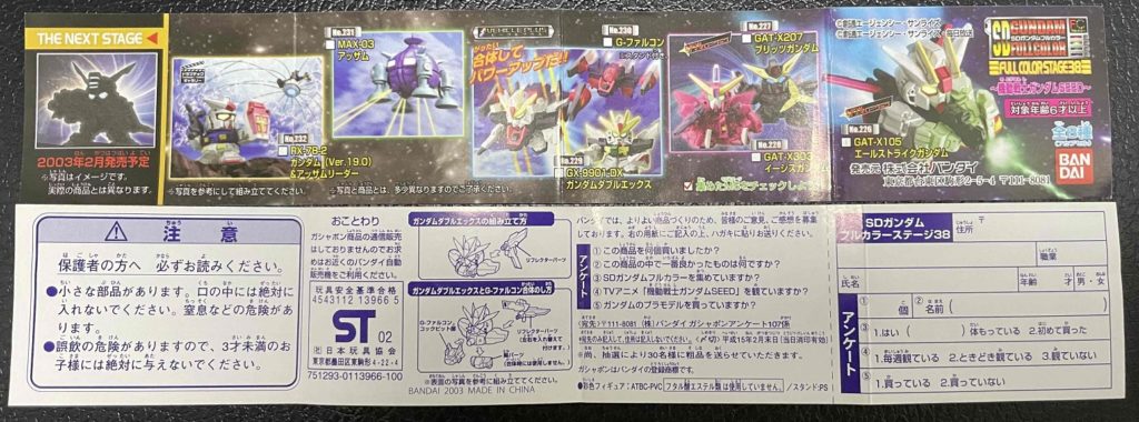 STAGE38の内容は、エールストライクガンダム、ブリッツガンダム、イージスガンダム、ガンダムダブルエックス、G-ファルコン、アッザム、ガンダム(Ver.19.0)&アッザムリーダーの全8種。